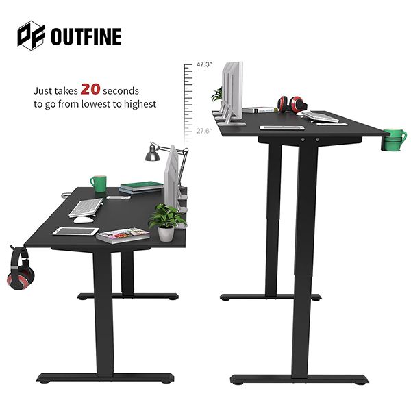 Dual Motor System - The OUTFINE height adjustable electric standing desk is equipped with a dual motor system, which guarantees powerful support to the height adjustment of the desk. In addition to the smooth height adjustment, the dual motor also works quietly, giving you a pleasant working environment. Height Memory Function - The height memory function can memorize three desk heights that you are comfortable with. The desk can be automatically adjusted to the memory height with a click of button. Additional Features - It is indeed annoying and upsetting that a cup of drink falls down by chance and spill the liquid all over your important document or expensive electronic devices. That is where the anti-spill cup holder comes in. Moreover, the desk also has a hook on which you can place your headset or bag. Solid Construction - Made of premium iron frame, solid desk board and powerful dual motors, the whole desk can support up to 180 lbs. You can set up your workstation with many office accessories and boost your productivity right now.Solid Construction: OUTFINE sturdy iron frame allows for a 180 lb weight capacity Responsive Customer Service - Customer service is one of our top priorities. Our customer service team would always be here for you. If you have any problem for our product and service, please feel free to contact us. We will listen to your voice with patience and give you a prompt response with practical solutions.