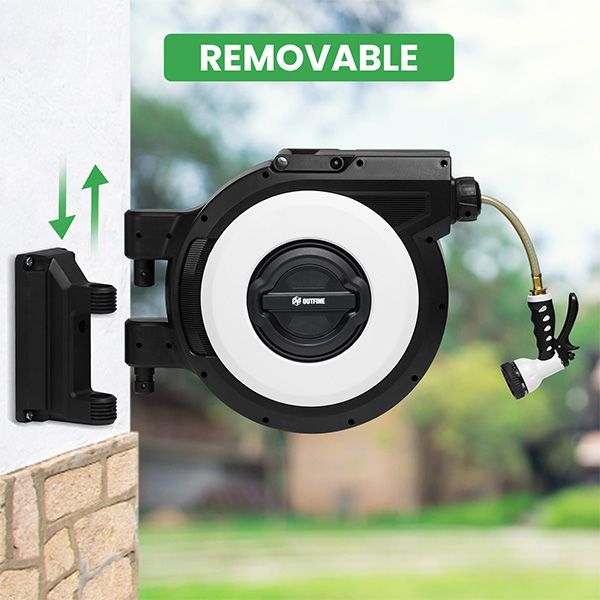 Any length lock: You can lock it wherever you want according to your needs, which it’s very convenient. In addition, you can customize the length of the hose exposed by adjusting the positioning ball when the hose reel is stored. Slow retraction function: The special internal structure can make the hose retract slower and smoother than other products. No worry about injuries from excessive retraction speed. Rotatable and more stable bracket: The wall bracket allows you to rotate 180 deg horizontally and remove it at any time. Also, we have a fixing screw for you if the hose reel needs to be fixed on the wall for a long time. In addition, the bracket will be fixed with 5 screws, which is more stable and you don't have to worry about the reel falling off. Premium material: Different from other products, the shaft inside the hose reel is made of aluminum. It’s high quality and more durable. Multi-mode nozzle: Equipped with 9 irrigation modes, the nozzle enables you to choose your favorite mode by yourself and use in different scenes.