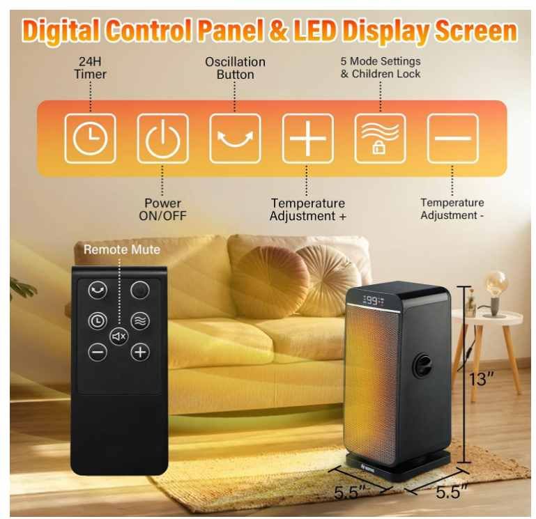 Secure Services: Our heater is equipped with V-0 flame retardant material, with 24 hours automatic shutdown function, overheat protection function and tip over protection function triple safety guarantee, with a child lock function to prevent children and pets from touching, when the heater is tipped over or the ambient temperature is higher than 122°F, the heater will stop heating and emit a buzzer. We will protect you and your family from all aspects. Provides a Comfortable experience: our heaters are equipped with LED digital display on the side, equipped with remote control (Battery not included); With memory function; For your intimate design of the automatic screen off function, in the case of no operation, the display will be turned off after 30 seconds, less than 40 decibels when working, the remote control is equipped with mute function, to provide you with a comfortable working or sleeping environment. Warm from Any Angle: Our heater adopts PTC ceramic heating technology, which can quickly heat the space, has 75°oscillating, which increases the air supply range and can evenly heat the space. our heater has an up and down air direction adjustment function, and you can adjust the heating air direction according to your needs. Five Modes of Regulation: Our heater provides a maximum power of 1500W, with 5 temperature adjustment settings (High/Low/ECO/MAX/Fan), you can adjust the mode you want according to your preferences and needs. Among them, in High/Low/ECO mode, you can change the temperature from 40°F to 99°F in 1°F increments. Portable and Suitable for Multiple Places: There is a built-in carrying handle on the back of our heater, which is easy to carry and move to any place, such as living room, bedroom, office, basement, etc.